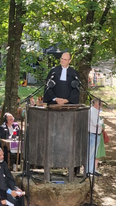 « Faire mémoire, c’est rendre présent pour soi, dans sa vie, la portée d’un événement passé. Nous recevons une mémoire qui n’est pas nostalgie, mais énergie », a relevé, dans sa prédication le pasteur Christian Krieger, président de la Fédération protestante de France (FPF), qui a présidé le culte de l’Assemblée du désert du 7 septembre dernier. Cette année encore, ce moment de ferveur a rassemblé environ 3 000 protestants dans la vaste clairière de Mialet, dans ces Cévennes où des huguenots ont été persécutés après la révocation de l’Édit de Nantes. Parmi eux, le conseil synodal de l’Église réformée d’Alsace-Moselle, sous la conduite de son président Pierre Magne de la Croix, mais aussi l’ancien président luthérien, Marc Lienhard, venu dédicacer son ouvrage sur les anabaptistes d’Europe. Car en rappelant que « l’Esprit souffle où il veut », les organisateurs ont commémoré le 500e anniversaire de la naissance de l’anabaptisme, rappelant que les mennonites, baptistes, évangéliques s’inscrivent aujourd’hui dans une extraordinaire diversité. En conclusion d’une après-midi où il fut question des anabaptistes alsaciens, la pasteure Joëlle Sutter-Razanajohary a plaidé pour « déconstruire les préjugés sur les évangéliques comme sur les luthéro-réformés, pour construire un avenir commun ». Pour sa part, Christian Krieger avait insisté aussi sur la vocation de la FPF – qui fête son 120e anniversaire en novembre – comme « lieu d’écoute où chacun accueille la parole de l’autre, en admettant de se laisser transformer par elle ».